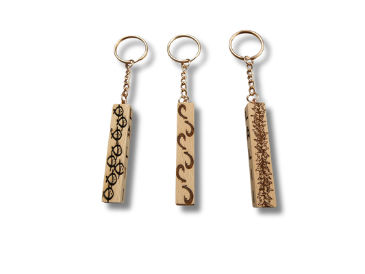 Collection of Bamboo Pens, Wooden Keychains, and Bottle Openers etched with our signature designs.